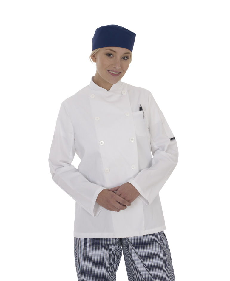 An economy priced long sleeve chef jacket with useful pockets that can be laundered up to 70º